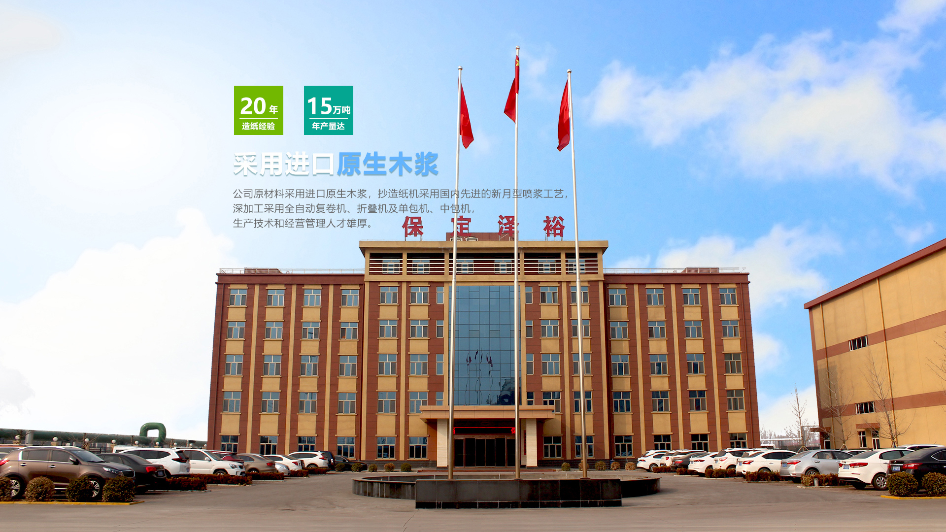 吉π衛(wèi)生紙保定澤裕新型材料有限公司坐落于素有北京南大門之稱的河北省文化古城保定市,位于順平縣經(jīng)濟(jì)開(kāi)發(fā)區(qū)北園,緊鄰“華北生活用紙產(chǎn)業(yè)基地“保定市滿城區(qū),地理位置優(yōu)越,現(xiàn)代信息通暢。公司生產(chǎn)銷售衛(wèi)生紙、面巾紙、手帕紙、餐巾紙等系列生活用紙,產(chǎn)品具有潔白柔和、細(xì)膩衛(wèi)生、超倍柔韌、吸收性強(qiáng)、容易降解等特點(diǎn),是集產(chǎn)品研發(fā)、生產(chǎn)、銷售為一體的大型公司。公司原材料采用進(jìn)口原生木漿,抄造紙機(jī)采用國(guó)內(nèi)先進(jìn)的新月型噴漿工藝,深加工采用全自動(dòng)復(fù)卷機(jī)、折疊機(jī)及單包機(jī)、中包機(jī),生產(chǎn)技術(shù)和經(jīng)營(yíng)管理人才雄厚。